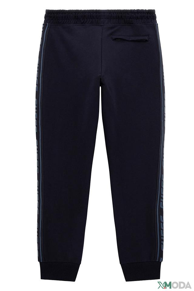 Модель отличается прямым кроем и эластичным поясом на шнуровке, что позволяет идеально подогнать брюки по фигуре. По бокам брюк расположены контрастные полоски голубого цвета, добавляющие динамичности и спортивного стиля. На левой штанине расположен небольшой логотип бренда.