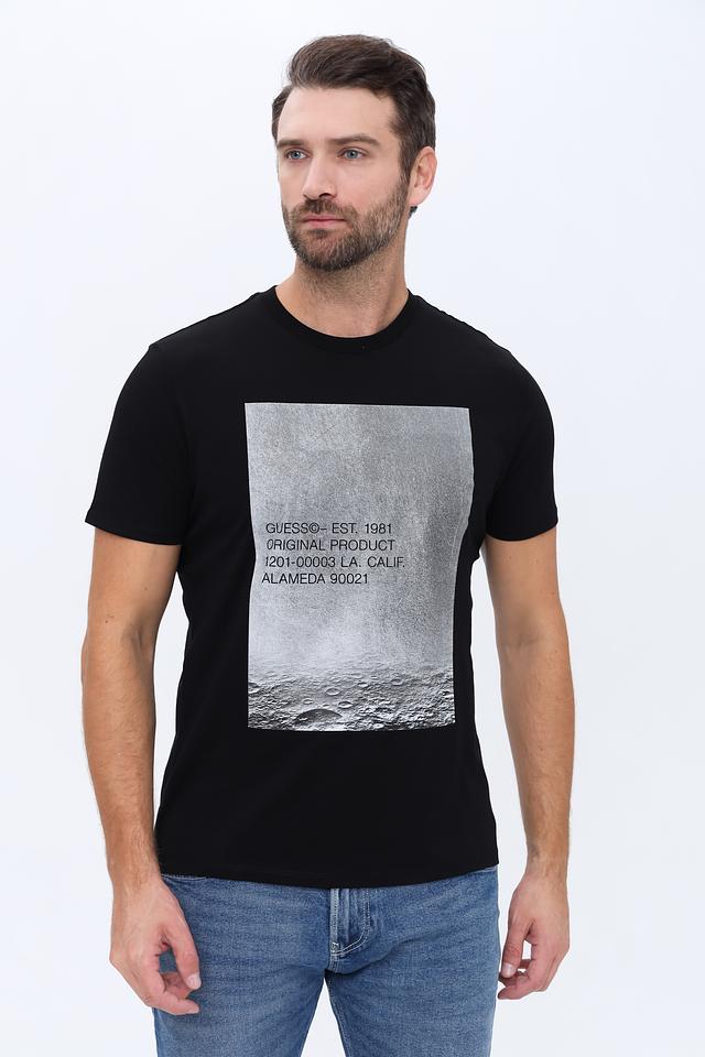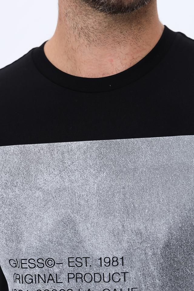 Чёрная футболка Guess с оригинальным принтом на груди. Изготовлена из 100% хлопка, обеспечивая комфорт и воздухопроницаемость. Стильный и лаконичный дизайн делает эту футболку отличным выбором для повседневного образа. Состав: хлопок 100%