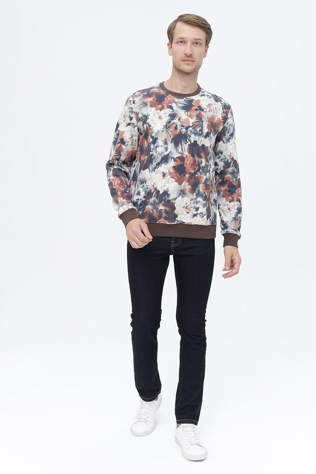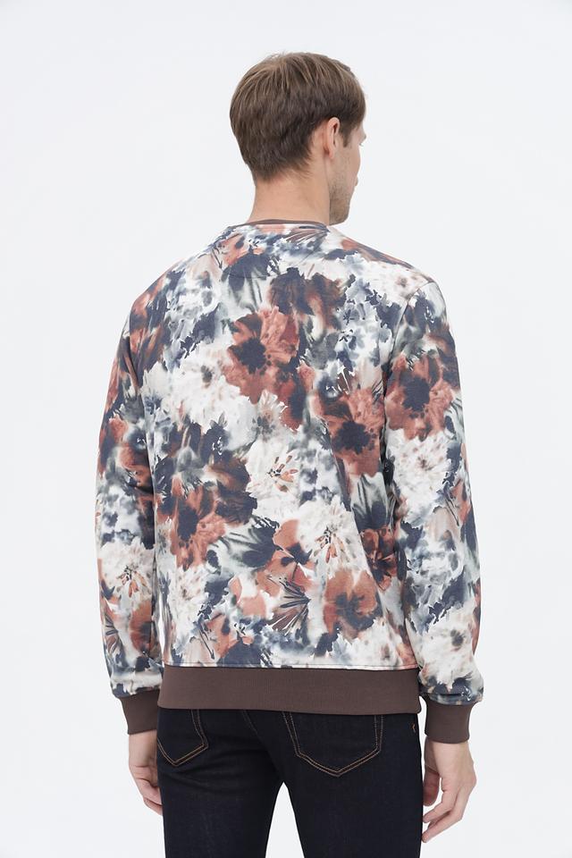 Основной цвет джемпера – коричневый, но его визуально доминирует яркий и красочный цветочный принт, выполненный в сочетании синих, красных, бежевых и белых оттенков. Принт придает изделию оригинальность и выразительность.