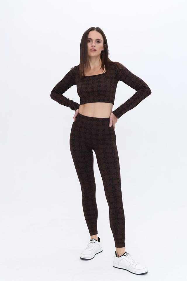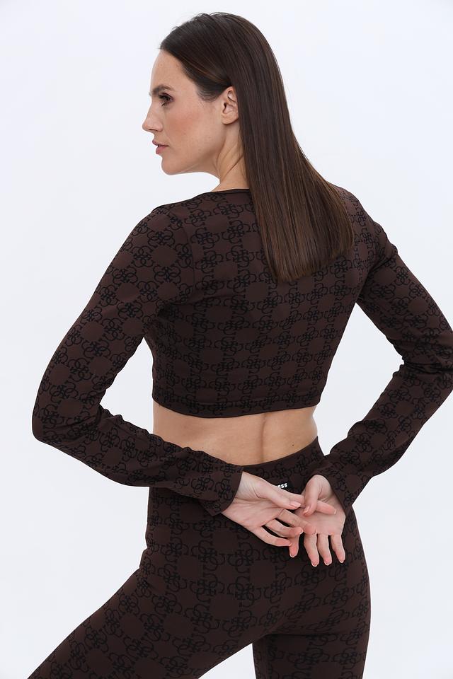 Топ имеет короткий крой и длинные рукава, выполнен из полупрозрачной ткани с фирменным логотипом бренда по всей поверхности. Квадратный вырез горловины добавляет изысканности.