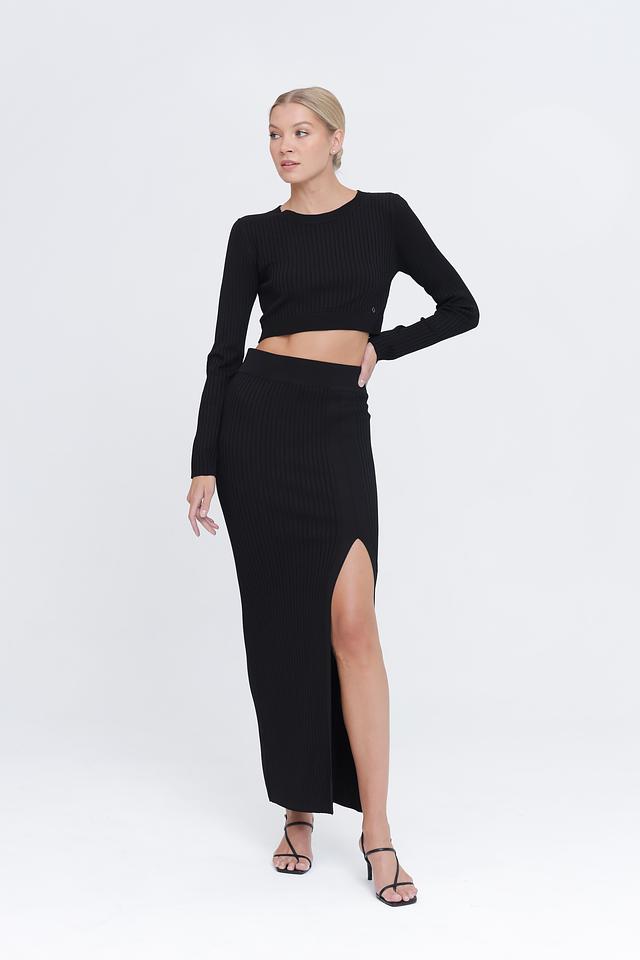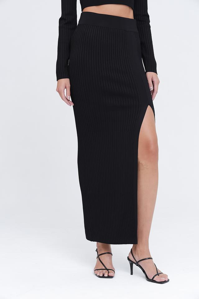 Модель имеет высокую посадку, подчеркивающую талию, и длину миди. Оригинальный разрез сзади добавляет образу динамичности и кокетства.