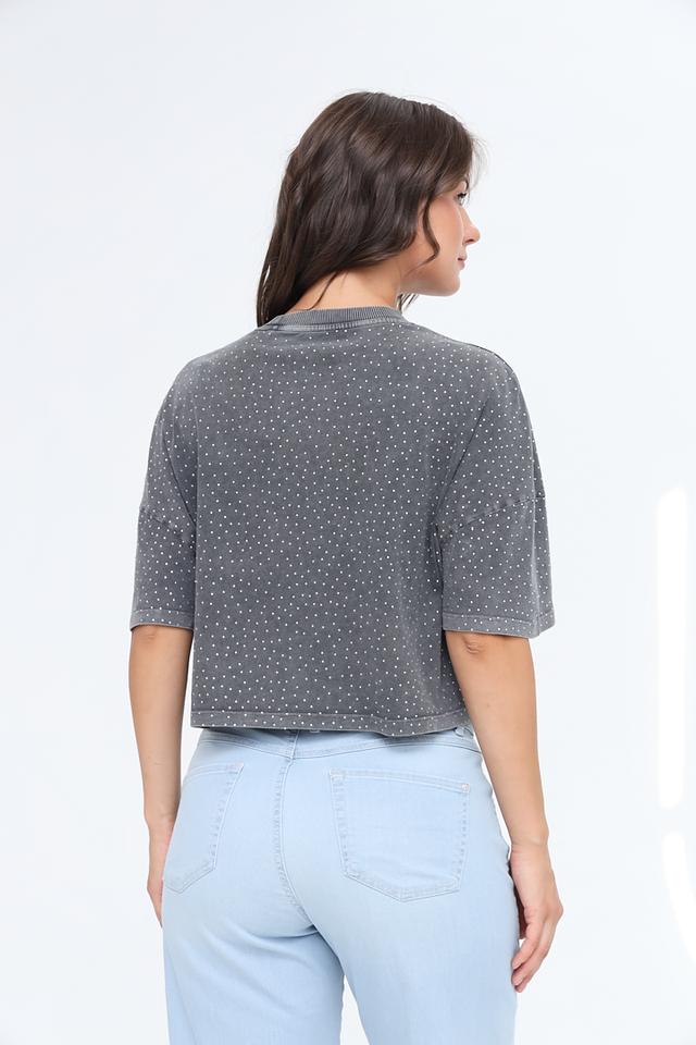 Футболка имеет короткие рукава и свободный крой, что делает ее идеальной для теплой погоды. Серый цвет с мелким белым рисунком придает ей современный и универсальный вид.