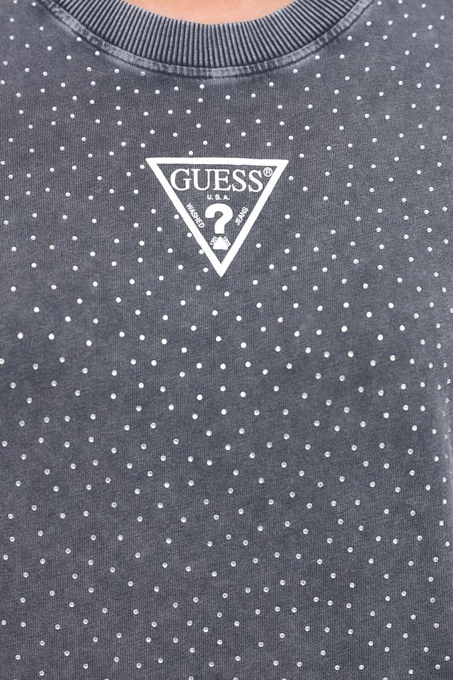 На передней части футболки расположен логотип бренда Guess, выполненный в контрастном белом цвете. Этот элемент дизайна подчеркивает принадлежность к известному бренду и добавляет образу индивидуальности.