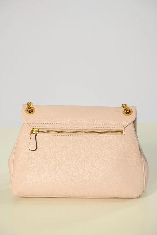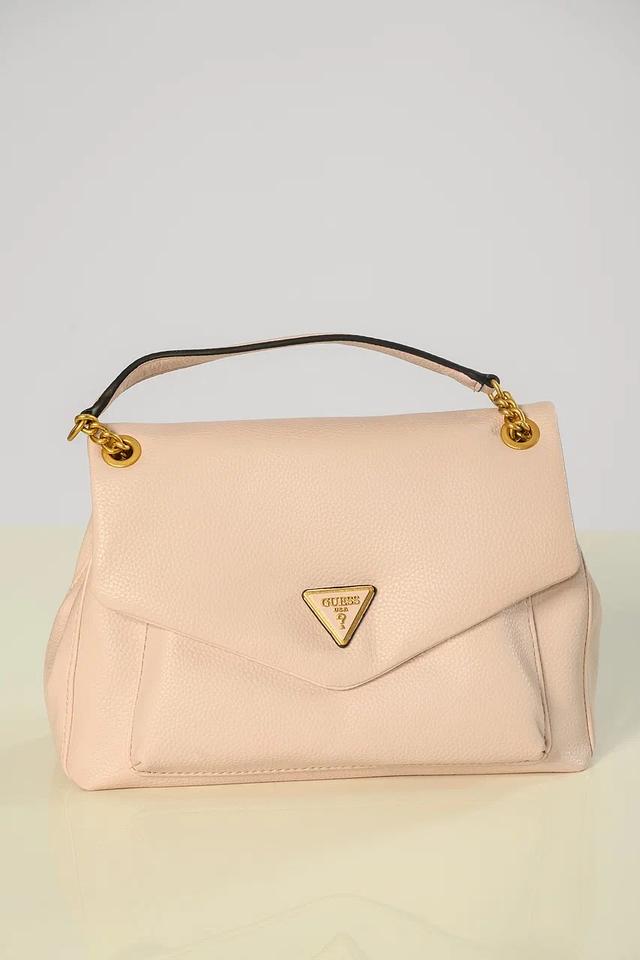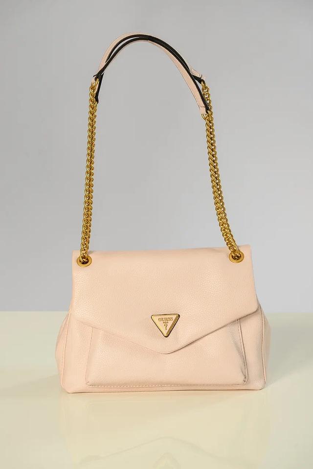 Сумка имеет удобную цепочку для ношения на плече, а также короткую ручку для ношения в руке. Передняя часть сумки украшена фирменным треугольным логотипом Guess с гравировкой. Застежка выполнена в золотистом цвете, что добавляет сумке изысканности.