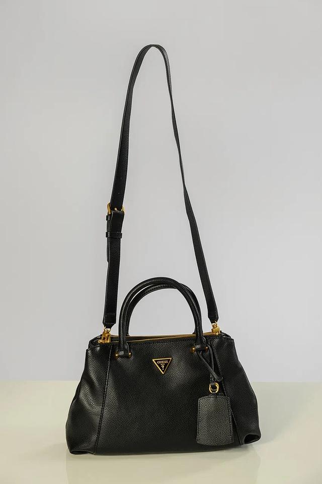 Чёрная сумка Guess – стильный аксессуар из полиуретана с золотистым логотипом. Модель оснащена двумя ручками и съёмным плечевым ремнём, что обеспечивает удобство ношения. Состав: полиуретан 100%