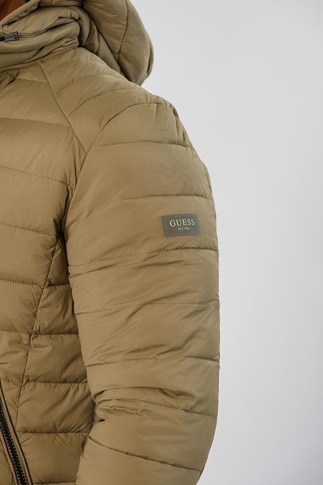 Куртка имеет стеганую текстуру, капюшон и застегивается на молнию. На передней панели расположены два боковых кармана на молнии, что делает ее практичной для повседневного использования. Логотип бренда Guess размещен на рукаве в виде небольшого патча.