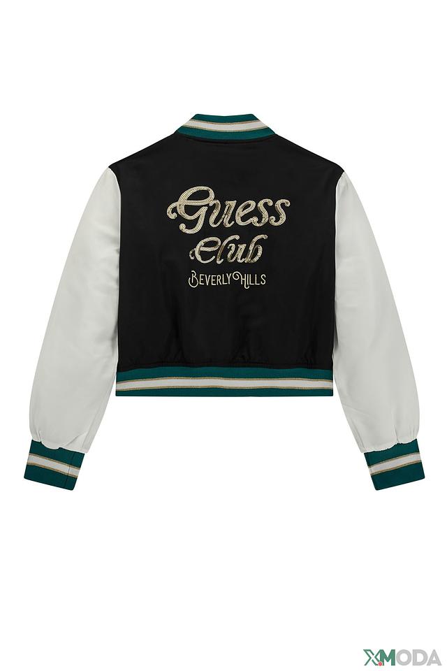 Основной цвет куртки – чёрный, который отлично сочетается с белыми и зелёными вставками на рукавах и воротнике. На куртке присутствуют яркие нашивки с логотипом бренда и надписями "Guess Club Beverly Hills", что делает её узнаваемой и привлекательной.