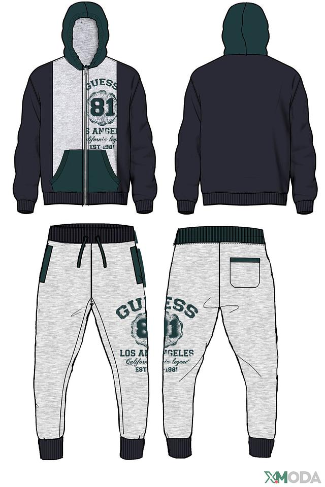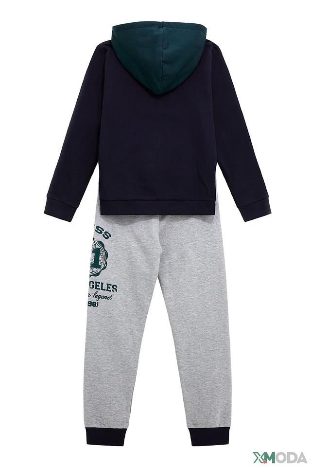 Этот комплект от Guess – отличный выбор для активных мальчиков. Он состоит из худи и брюк, выполненных в сочетании синего и серого цветов.