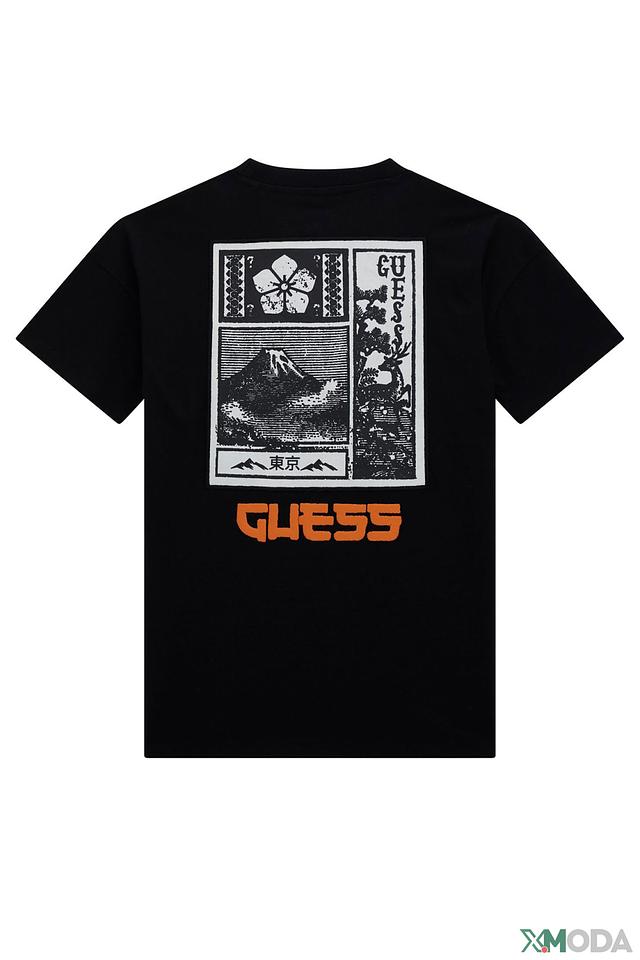 На передней части футболки расположен яркий логотип бренда Guess, выполненный в оранжевом цвете. На спине изображена красочная графика в японском стиле с изображением горы Фудзи и традиционными цветами сакуры, а также надпись "GUESS" и иероглифы.