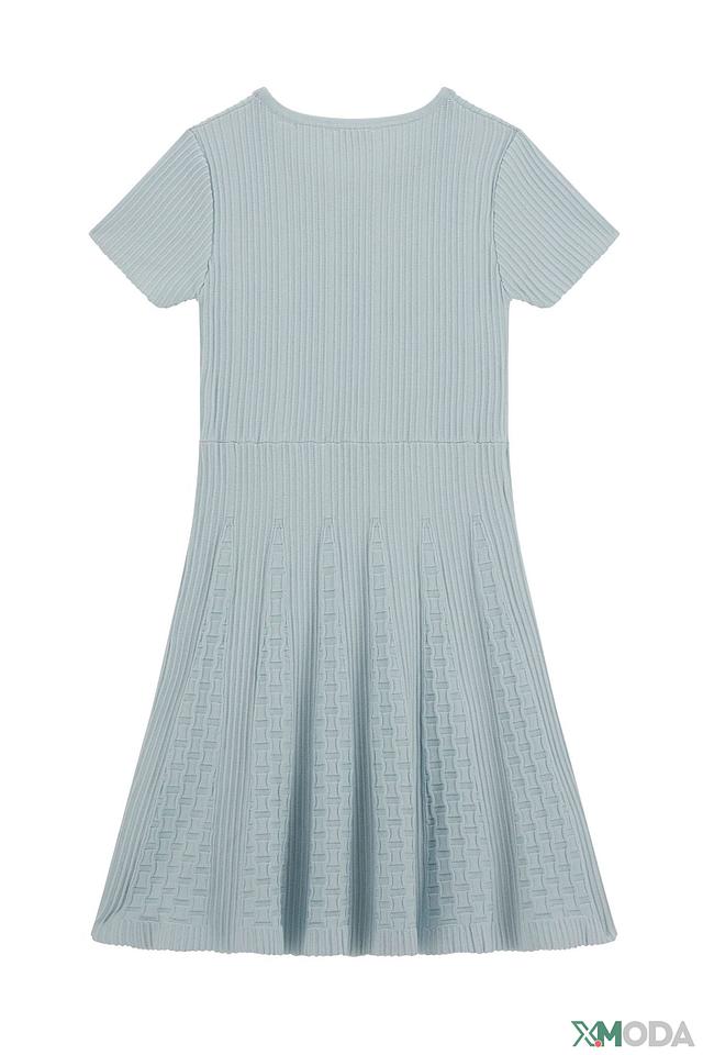 Модель имеет прямой крой с короткими рукавами и круглым вырезом горловины. Верхняя часть платья выполнена из гладкого трикотажа в рубчик, а юбка – из фактурного рифленого материала, что создает интересный контраст. Талия подчеркнута эластичной резинкой.