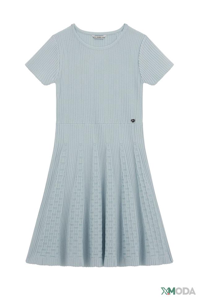 Голубое платье от Guess для девочек выполнено из текстурированной ткани с короткими рукавами. Модель имеет приталенный силуэт и расклешенную юбку, украшенную фактурным узором. Состав: вискоза 50%, полиамид 31%, полиэстер 19%