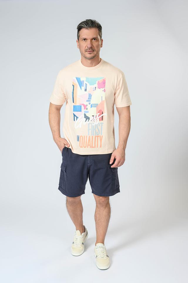 Мужская футболка Guess нежно-розового цвета с ярким абстрактным принтом и надписью "FIRST IN QUALITY". Изготовлена из 100% хлопка, обеспечивающего комфорт и воздухопроницаемость. Состав: хлопок 100%