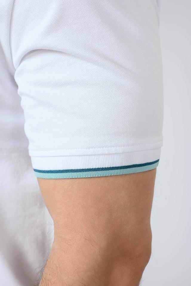 Данная модель выполнена в классическом белом цвете и отличается аккуратной отделкой по воротнику и рукавам в бирюзовом цвете. Воротник выполнен из эластичной ткани, что обеспечивает комфортную посадку по фигуре. На груди вышит логотип бренда Guess, выполненный в тон отделки.