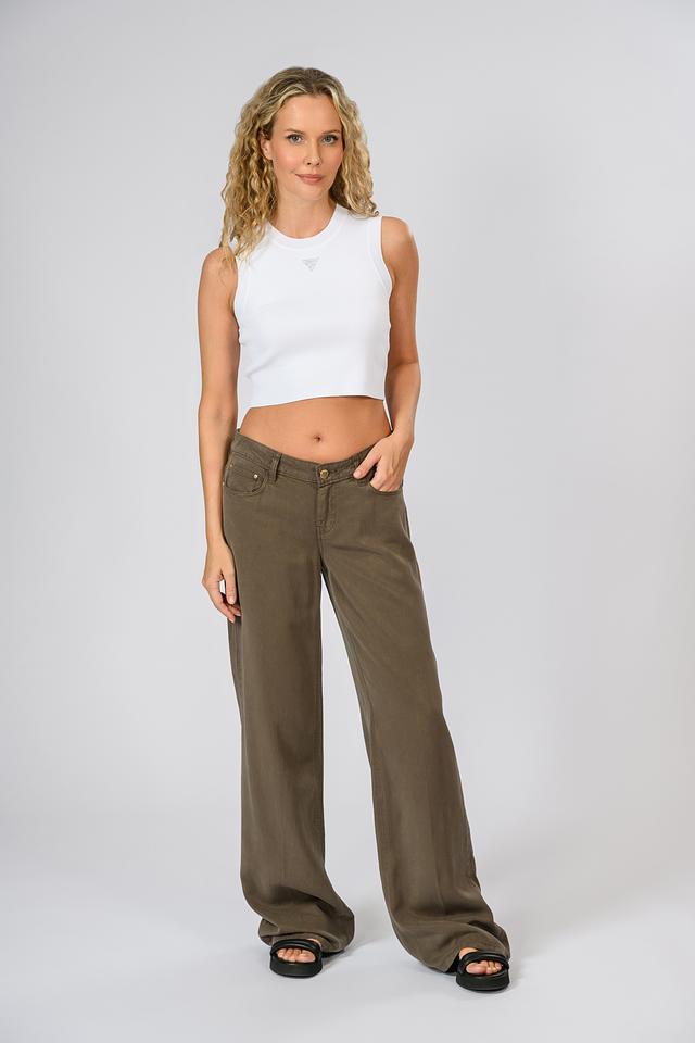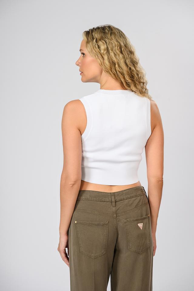Белый укороченный топ Guess из трикотажа с круглым вырезом горловины, украшенным логотипом бренда. Модель без рукавов, выполнена в облегающем силуэте, идеально подходит для создания летних образов. Состав: полиамид 53%, вискоза 47%