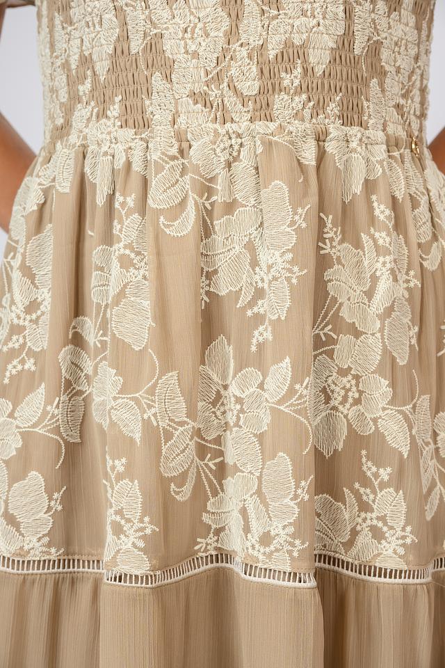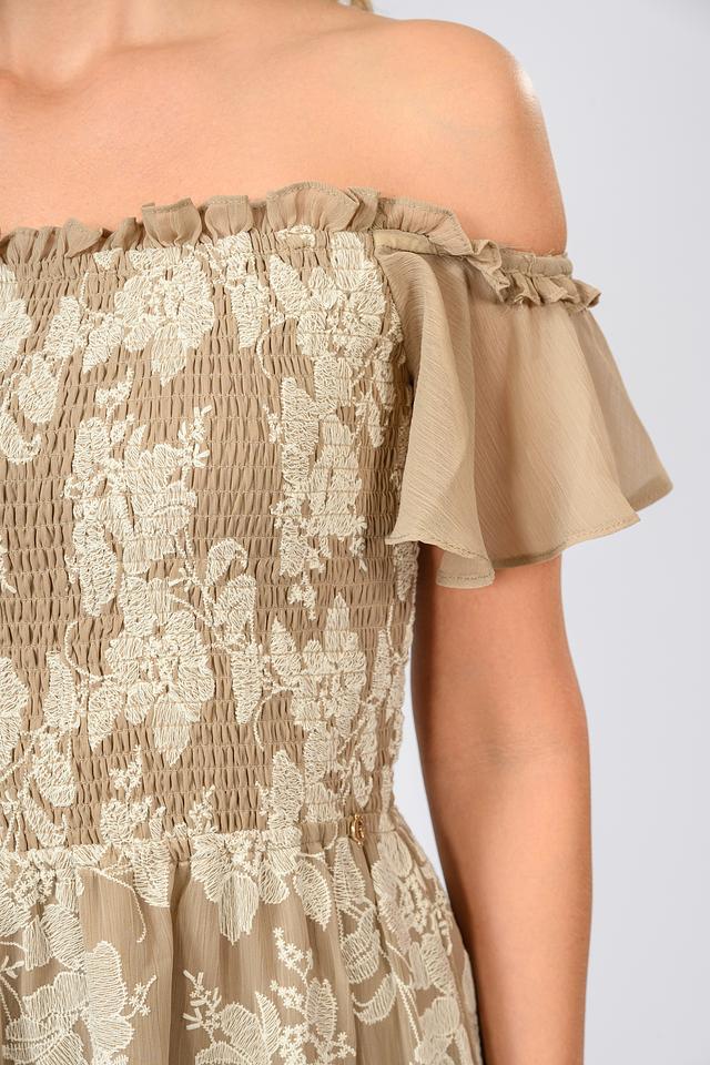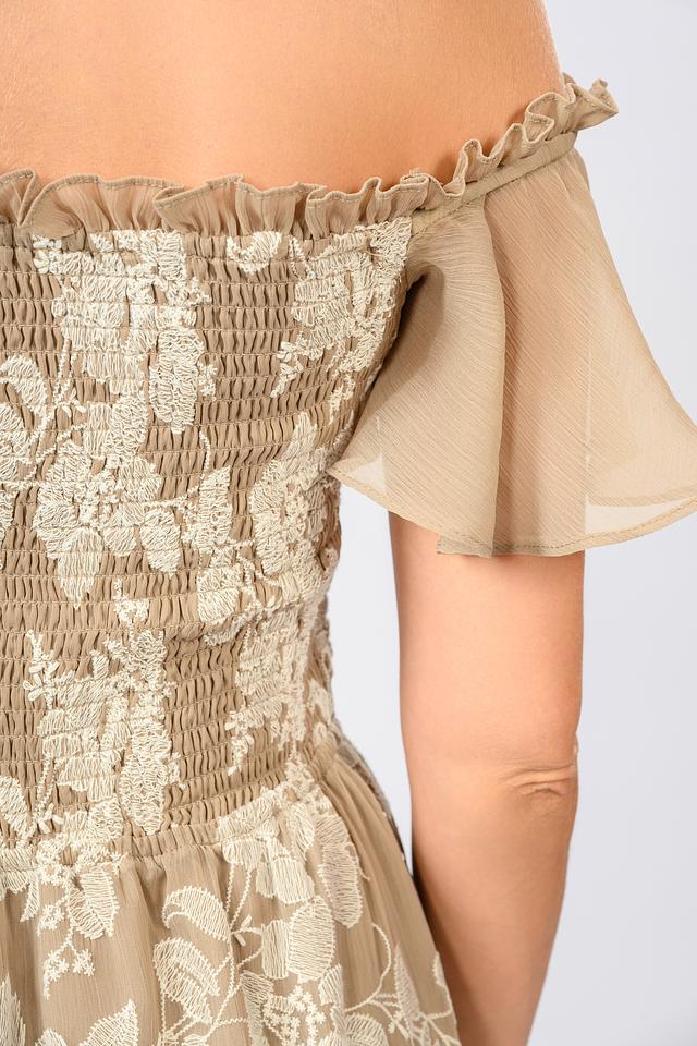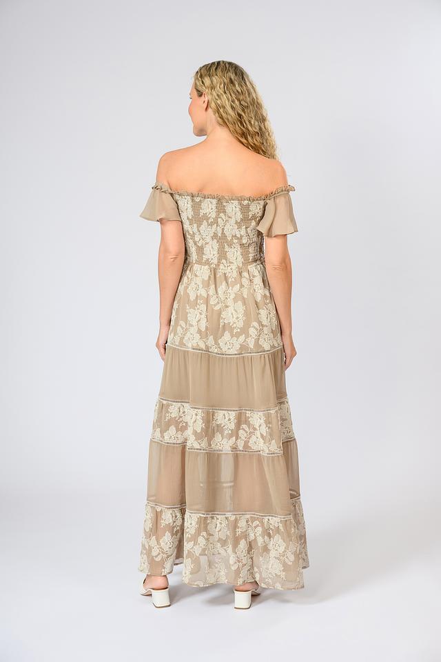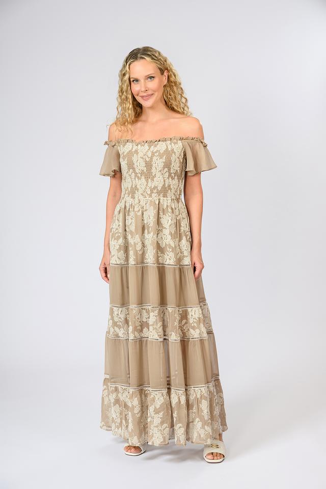 Модель имеет длину макси, открытые плечи и рукава-воланы, что делает ее идеальным выбором для летних вечеров и особых случаев. Эластичная ткань обеспечивает комфортную посадку по фигуре, а многослойный силуэт добавляет образу легкости и воздушности.