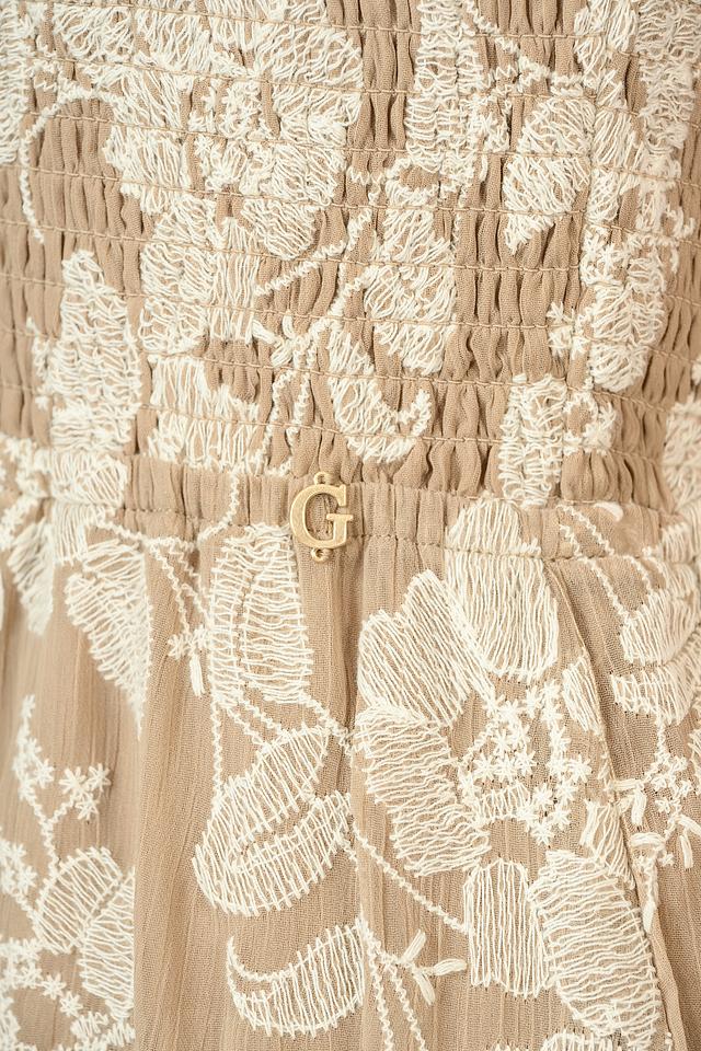 Это элегантное платье от Guess станет прекрасным дополнением вашего гардероба. Платье выполнено в нежном бежевом цвете и украшено изысканным цветочным принтом, который придает ему романтичный вид.