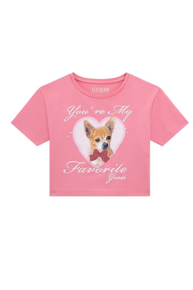 Розовая футболка Guess для девочки с ярким принтом в виде чихуахуа в сердечке. Изготовлена из мягкого хлопка с добавлением эластана для комфорта и свободы движений. Стильный и милый образ для юных модниц! Состав: хлопок 95%, эластан 5%