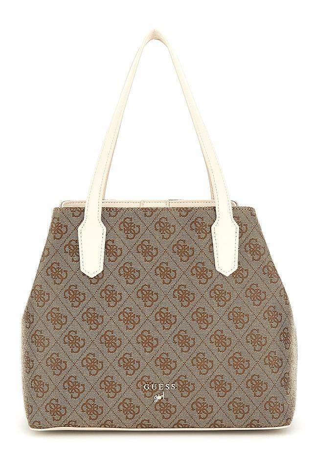 Эта очаровательная сумка от Guess станет прекрасным дополнением к образу юной модницы. Сумка выполнена в бежевом цвете и украшена узнаваемым логотипом бренда по всей поверхности.