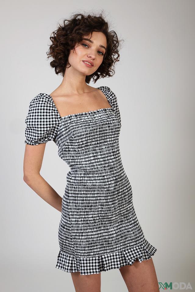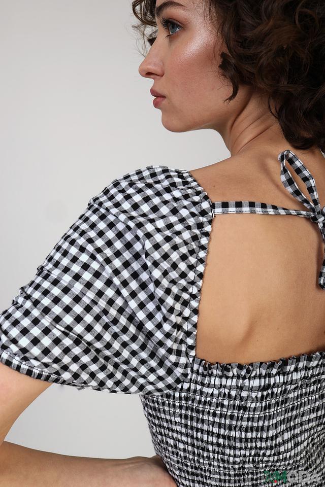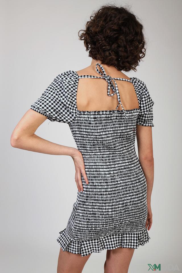 Платье выполнено в классическую чёрно-белую клетку, которая всегда актуальна. Юбка платья украшена оборками, что придает образу лёгкость и кокетливость. Спинка платья открытая, с тонкими перекрещивающимися бретелями.