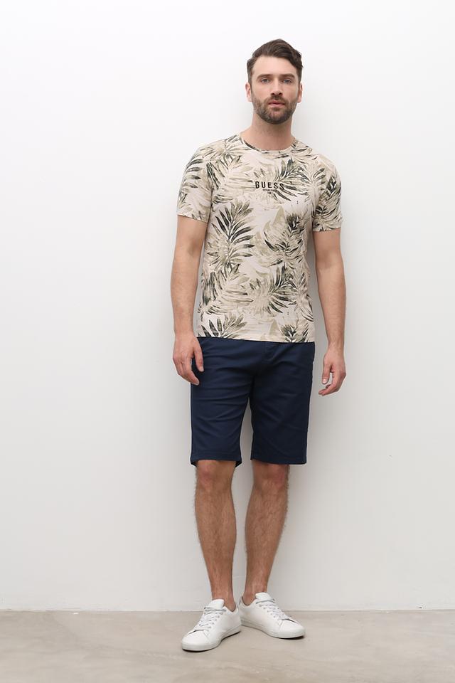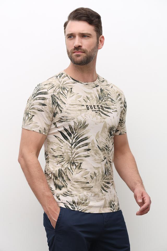 Мужская футболка Guess бежевого цвета с ярким тропическим принтом. Изготовлена из 100% хлопка, обеспечивающего комфорт и воздухопроницаемость. Стильный и удобный выбор для повседневного образа. Состав: хлопок 100%