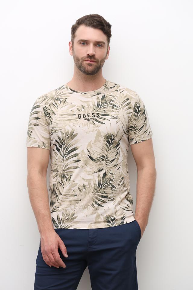 Футболка имеет классический крой и короткие рукава. Главная особенность модели – яркий и стильный принт с изображением тропических листьев, выполненный в оттенках зелёного и бежевого. Логотип бренда Guess расположен на груди.