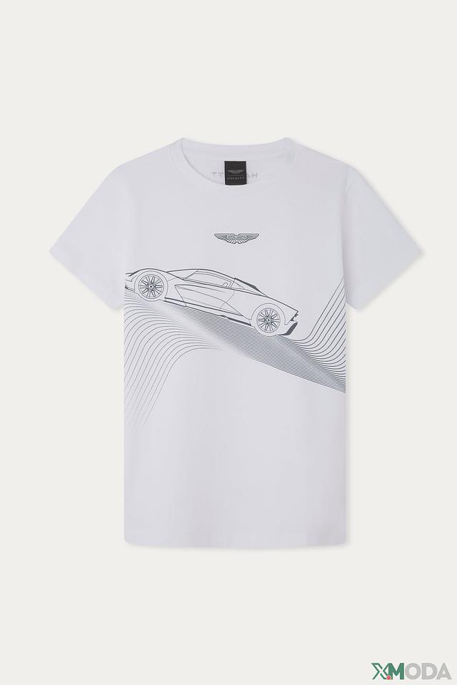 Дизайн футболки украшен графичным принтом автомобиля и логотипом бренда, что придает ей стильный и современный вид. Краткий рукав и классический круглый вырез делают эту футболку универсальной для различных случаев.