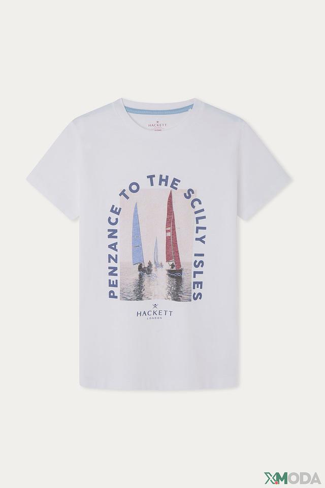 Особенности дизайна: на футболке изображен яркий принт с парусниками и надписью "Penzance to the Scilly Isles", что придает ей стильный и запоминающийся вид. Классический крой и короткие рукава делают футболку удобной для активных игр и повседневной носки.