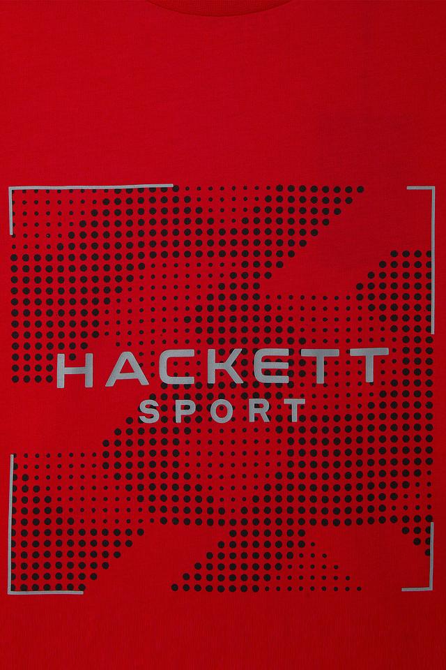 Дизайн футболки дополнен стильным принтом с логотипом Hackett Sport, выполненным в графитовом цвете и заключенным в прямоугольную рамку с точками. Логотип бренда также присутствует на спине.