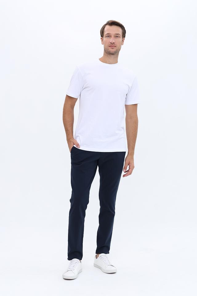 Брюки выполнены из высококачественного хлопка с добавлением эластана, что делает их приятными на ощупь, комфортными в носке и устойчивыми к деформации. Ткань хорошо держит форму и не требует особого ухода.