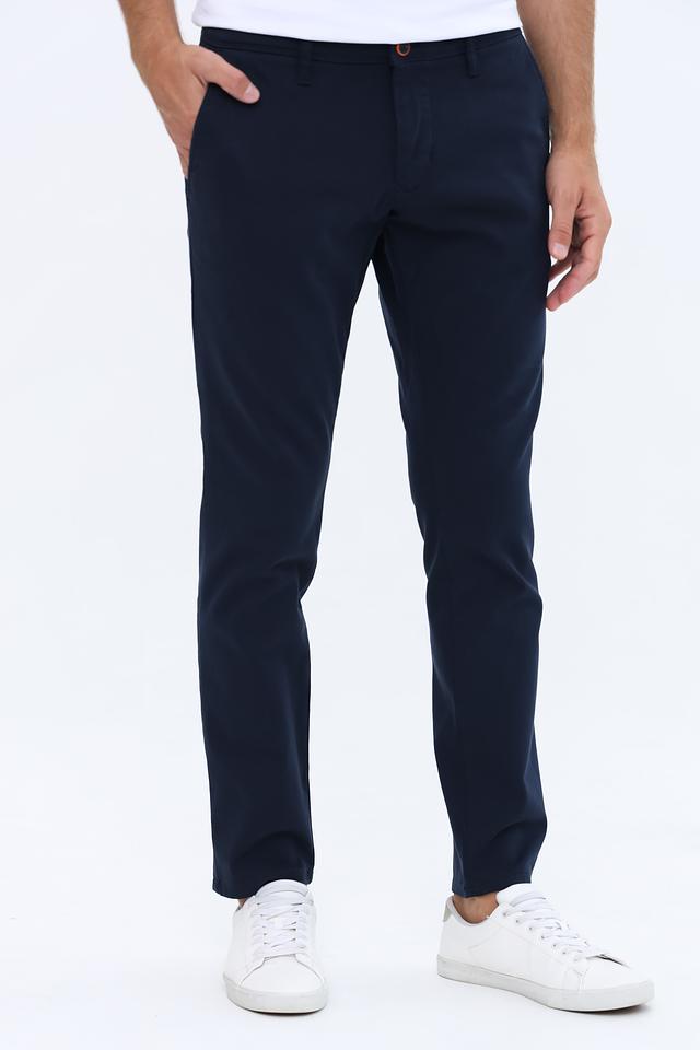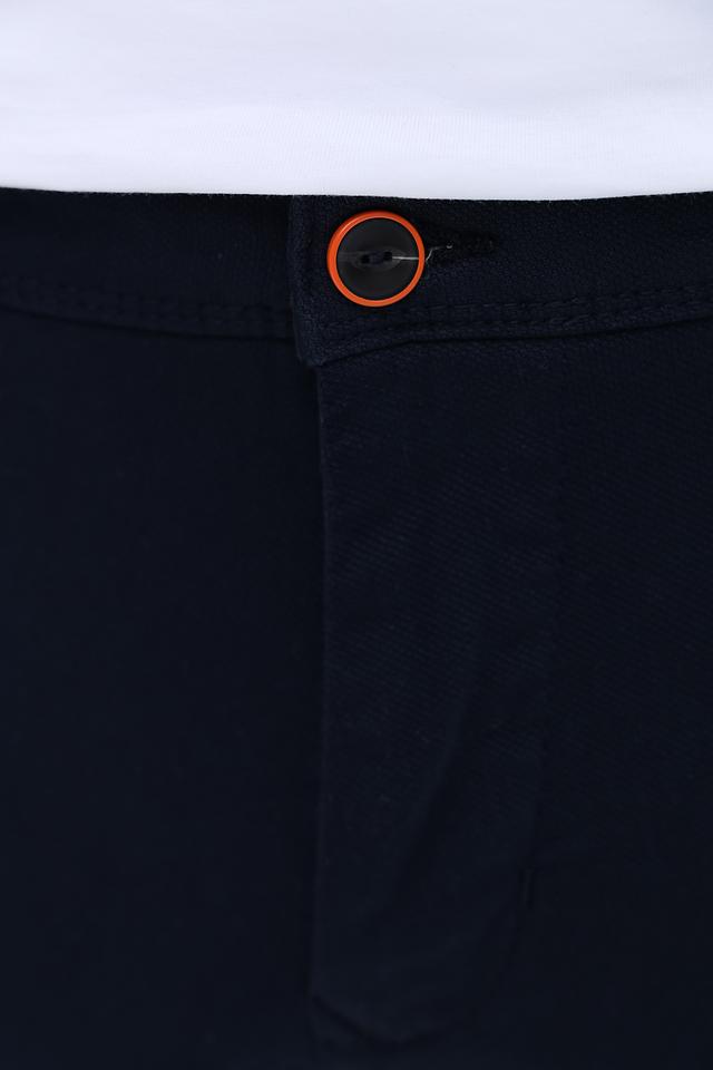 Цвет брюк – насыщенный темно-синий, который легко сочетается с различными элементами гардероба. Застежка на пуговице и молнии, а также наличие боковых и задних карманов делают брюки практичными и функциональными. Отличительной деталью является оранжевая пуговица на поясе.