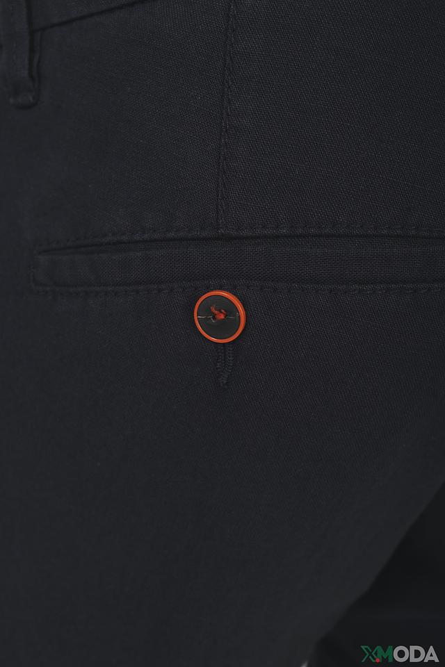 Брюки имеют стандартную посадку, застежку на пуговицу и петлю, а также функциональные карманы. Декоративная оранжевая пуговица на заднем кармане добавляет оригинальности. Ткань приятна на ощупь и хорошо держит форму.