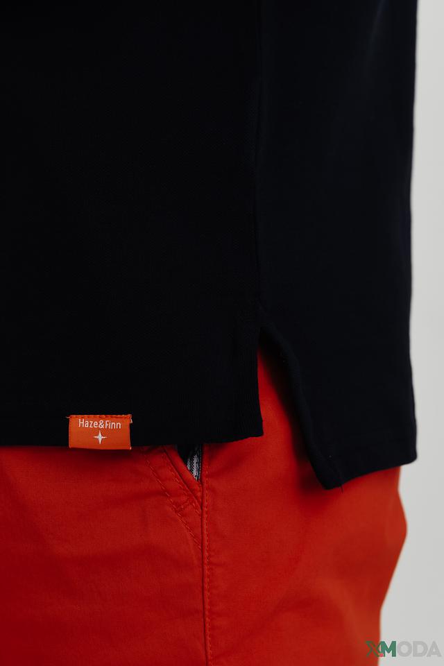 Мужское поло от бренда Haze and Finn выполнено в классическом стиле. Основной цвет – тёмно-синий, который дополнен яркой оранжевой отделкой по краю воротника, рукавов и нижней кромки. На левой стороне груди расположено небольшое белое лого в виде щита с аббревиатурой бренда.