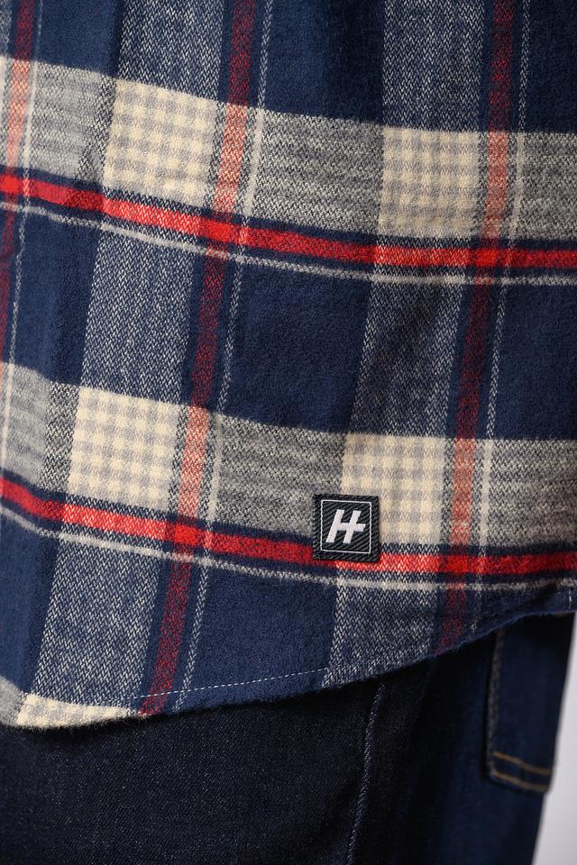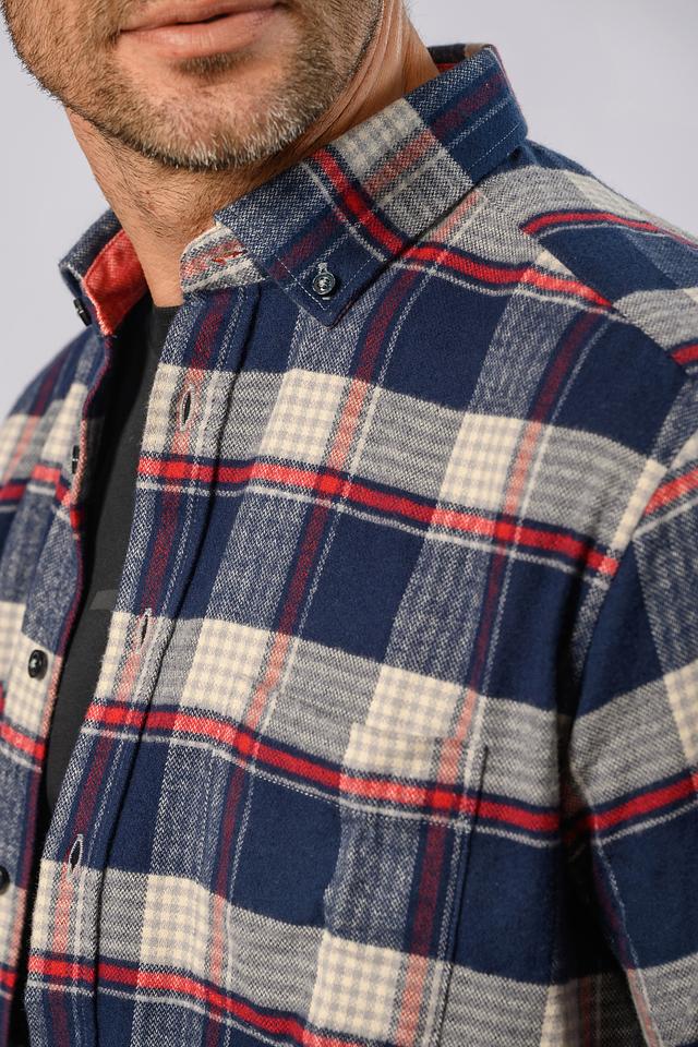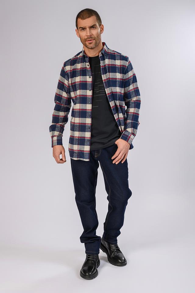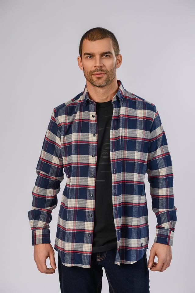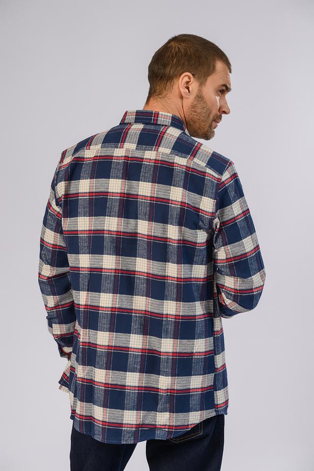 Рубашка выполнена в классическом крое с длинными рукавами и традиционным воротником. Особенностью модели является яркий клетчатый принт, сочетающий в себе оттенки синего, белого и красного. Небольшой логотип бренда расположен на груди.
