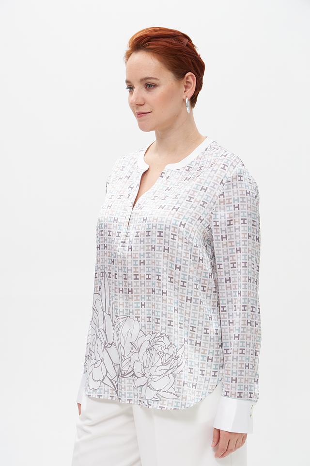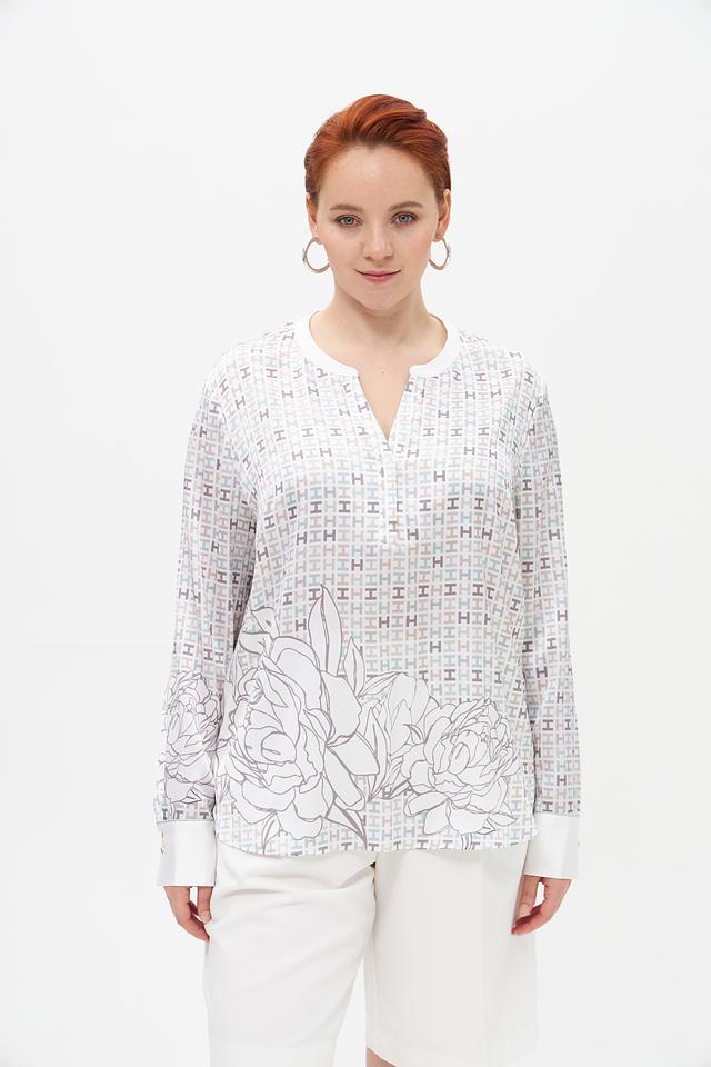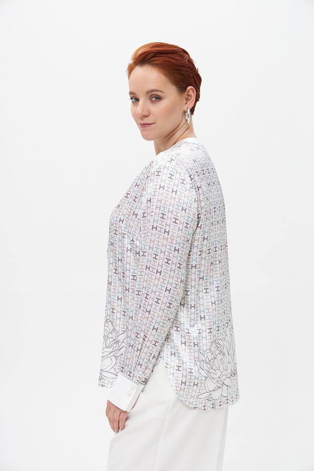 Модель имеет V-образный вырез и длинные рукава. Принт представлен в виде повторяющихся элементов и крупных изображений цветов. Блузка выполнена из высококачественного шёлка (95%) с добавлением эластана (5%), что обеспечивает комфорт при носке и приятные тактильные ощущения.