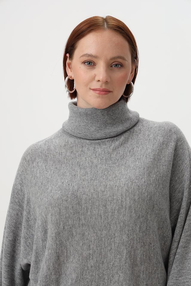 Пуловер имеет свободный крой, который не сковывает движений, и высокий горл, который защитит от холода. Объёмные рукава придают изделию лёгкость и оригинальность.