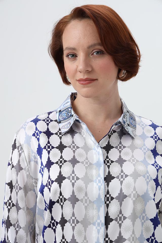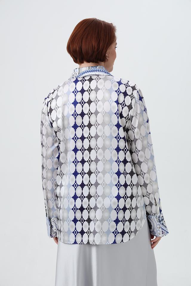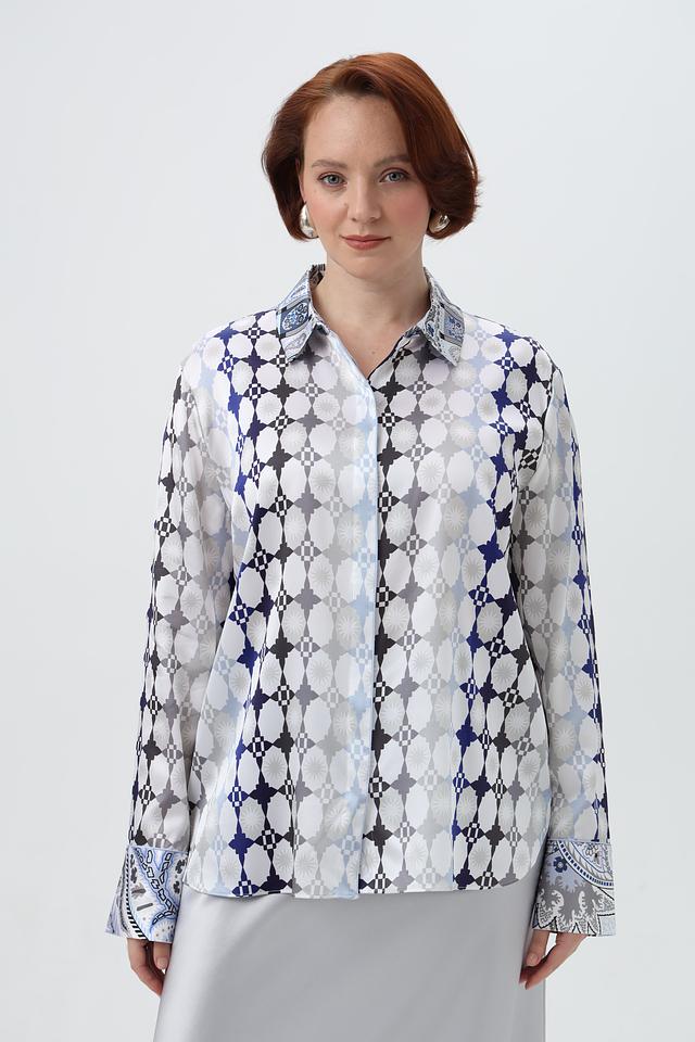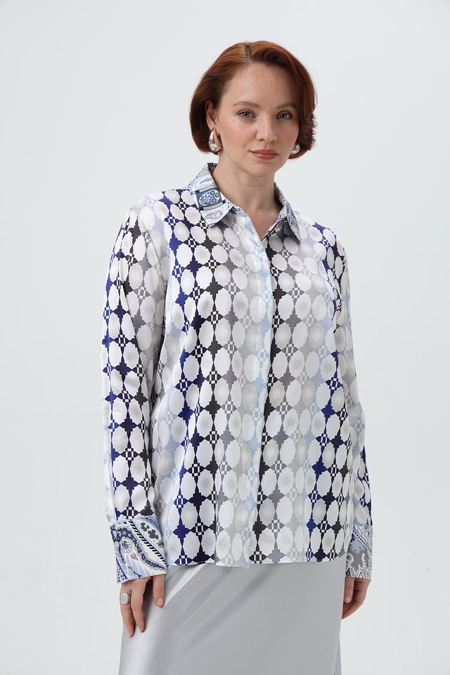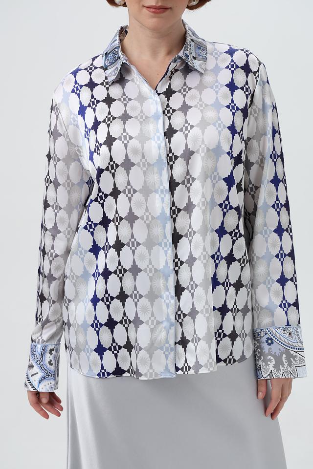 Эта блузка прекрасно сочетается с юбками, брюками и джинсами, позволяя создавать разнообразные образы – от деловых до повседневных. Декоративные манжеты с принтом добавляют изысканности и завершенности образу.