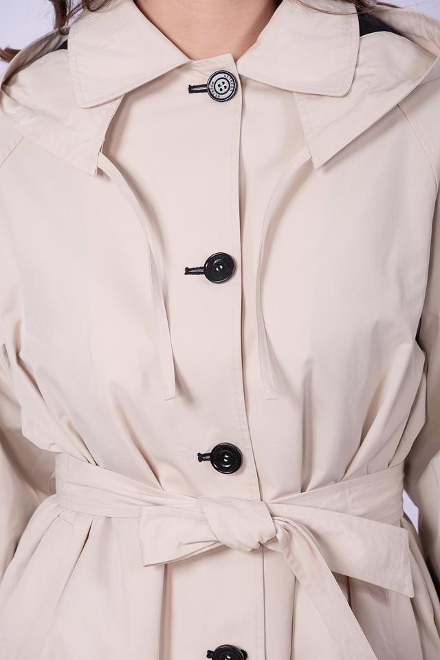 Плащ имеет прямой крой, длину до середины икры и удобный капюшон, который защитит от ветра и дождя. Застежка на кнопки обеспечивает надежную фиксацию, а пояс позволяет подчеркнуть талию и создать более женственный силуэт.