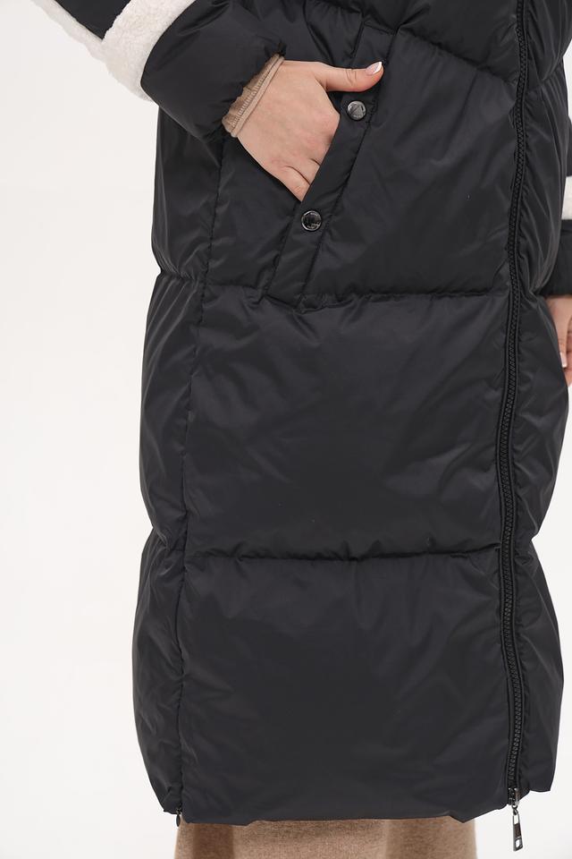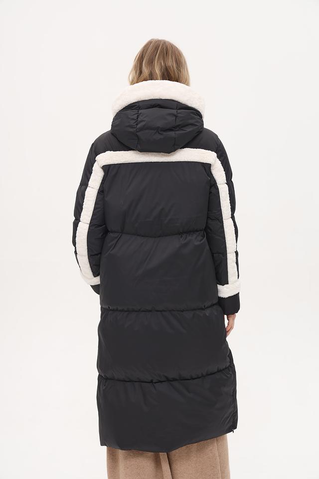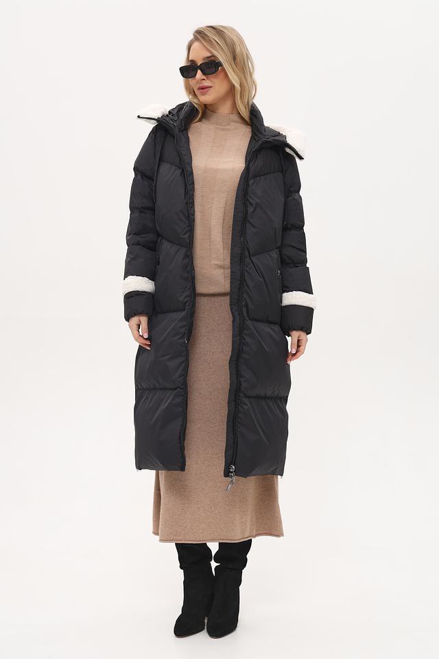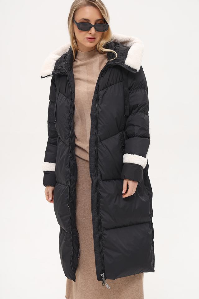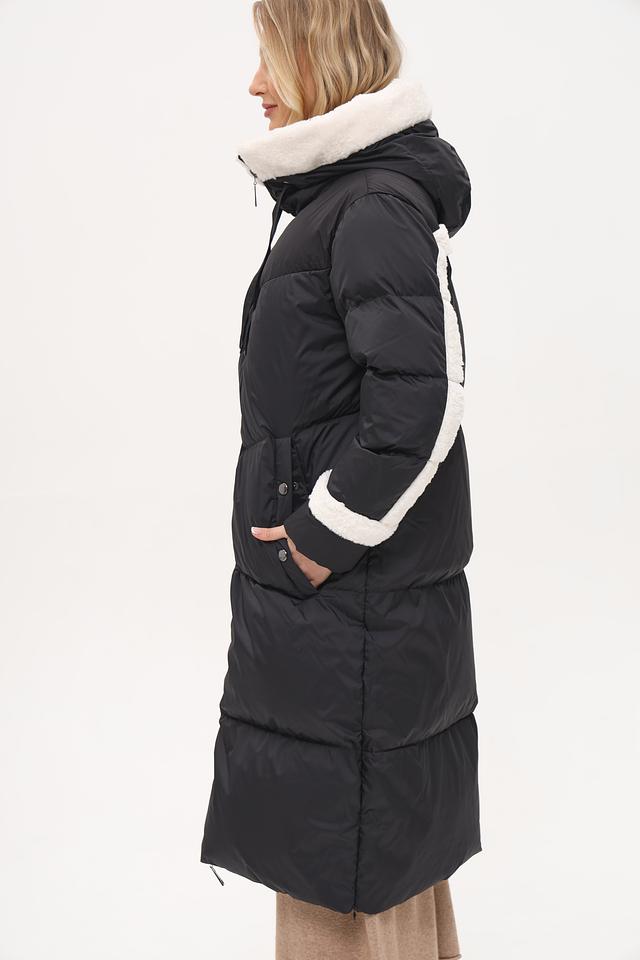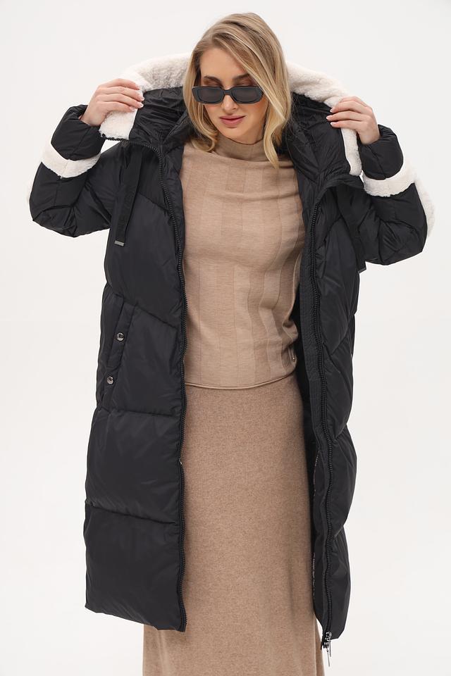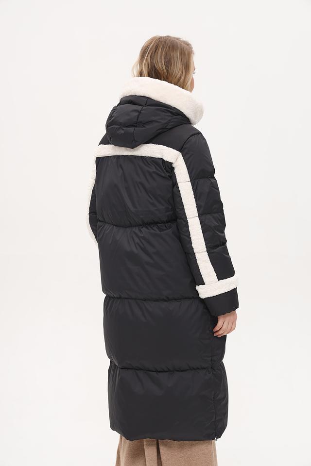 Пальто имеет удобный капюшон, отделанный искусственным мехом белого цвета, что обеспечивает дополнительную защиту от холода и ветра. Рукава и боковые вставки также декорированы контрастной белой отделкой, создавая эффектный визуальный акцент.