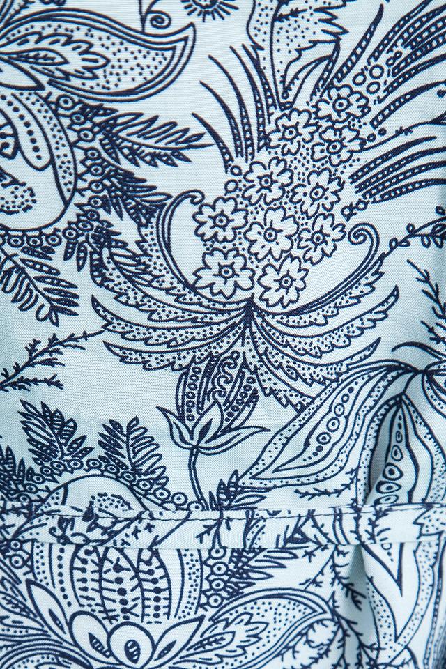 Эта блуза от бренда Horosha выполнена из приятной на ощупь ткани, сочетающей в себе вискозу и хлопок. Преобладающий цвет – голубой, украшенный изысканным цветочным принтом в синих и белых тонах.