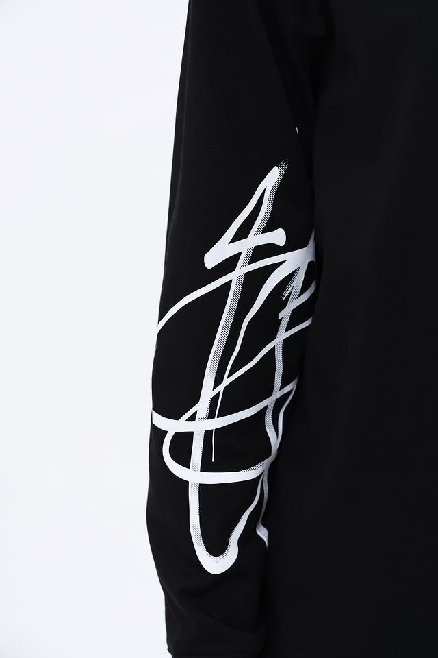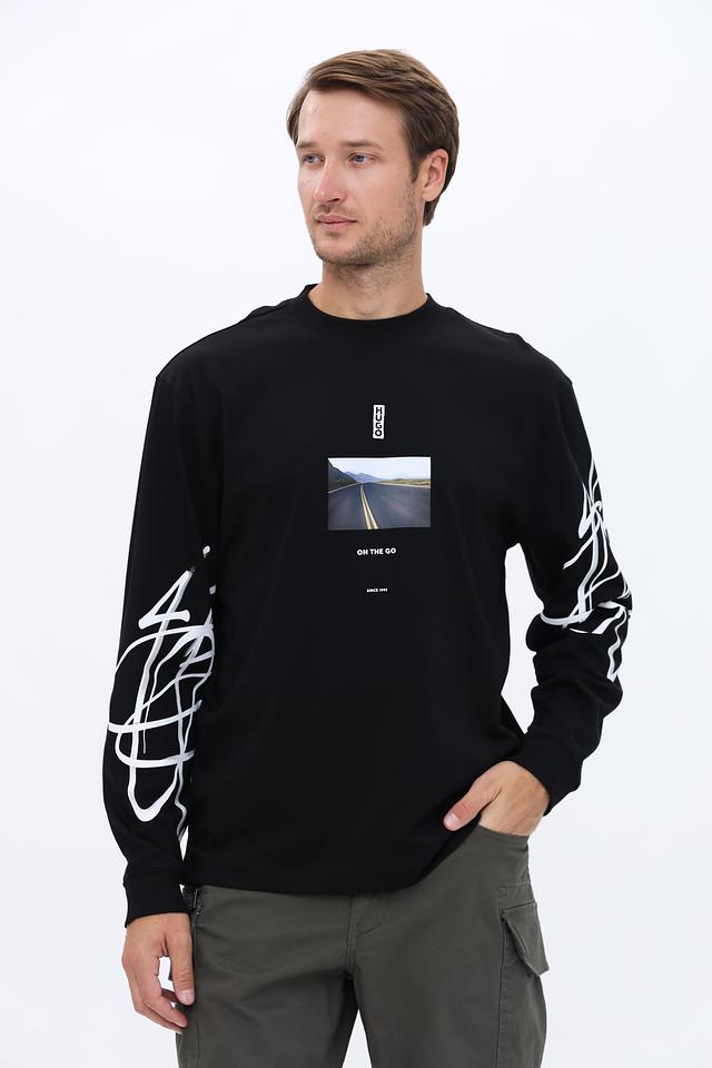 Модель имеет длинные рукава и круглый вырез горловины. Главная особенность – яркий графический принт на груди и рукавах, который придает образу индивидуальность и современный вид. Принт выполнен в белом цвете и состоит из абстрактных элементов и изображения дороги.