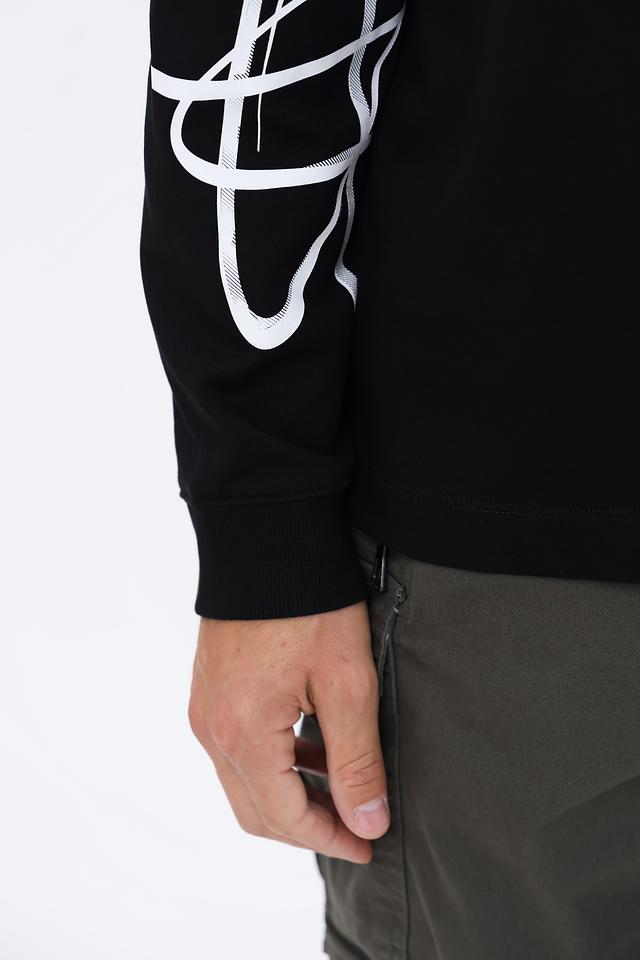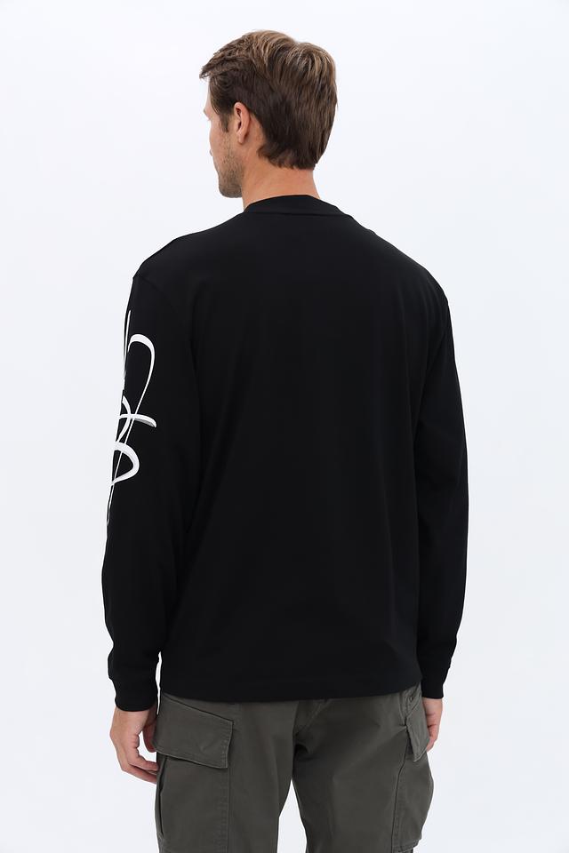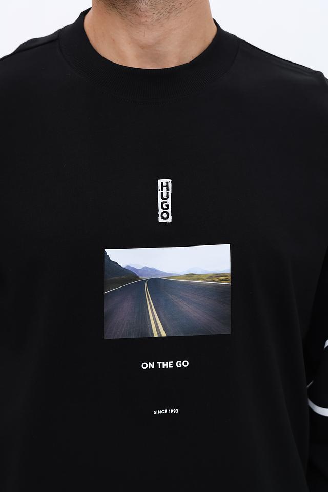 Чёрная футболка Hugo с длинным рукавом и оригинальным принтом на груди и рукавах. Изготовлена из 100% хлопка, обеспечивающего комфорт и воздухопроницаемость. Состав: хлопок 100%