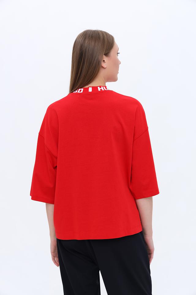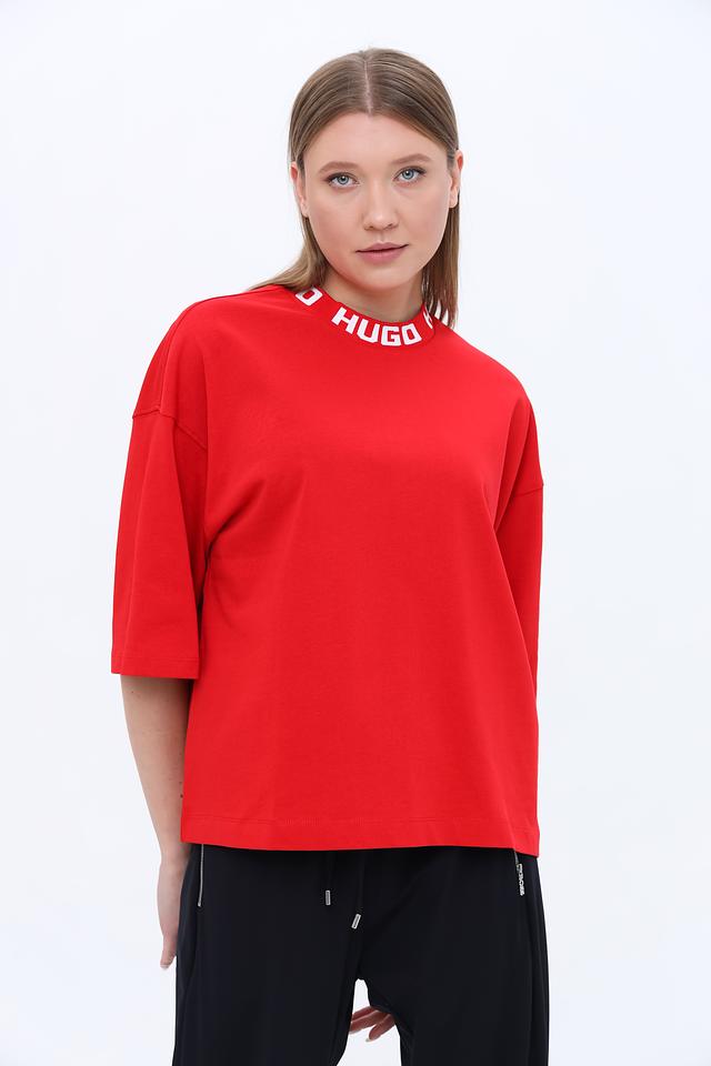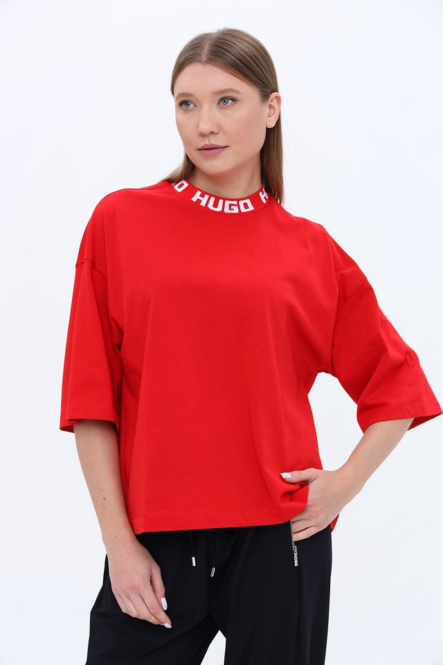 Женская футболка Hugo насыщенного красного цвета выполнена в свободном оверсайз крое. Модель с короткими рукавами и круглым вырезом горловины, украшенным логотипом бренда. Изготовлена из 100% хлопка. Состав: хлопок 100%