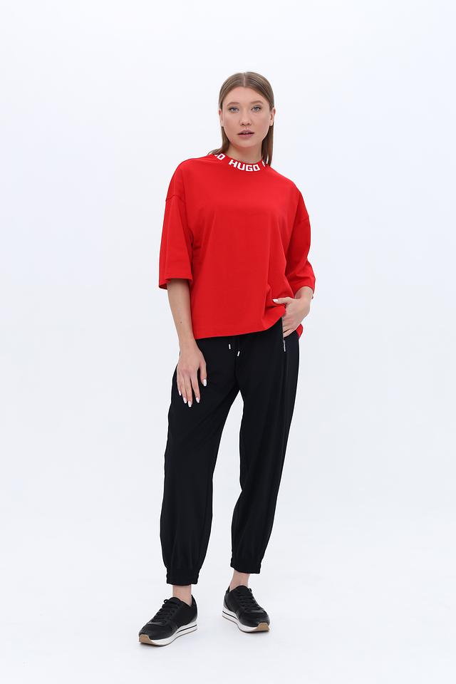 Особый акцент в дизайне – это широкая планка на горловине с контрастным логотипом Hugo, выполненным белым цветом. Этот элемент придает футболке узнаваемый и лаконичный вид. Футболка идеально сочетается с джинсами, брюками или юбками, позволяя создавать разнообразные стильные комплекты.