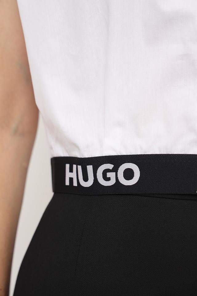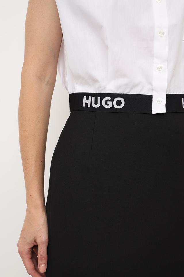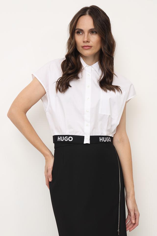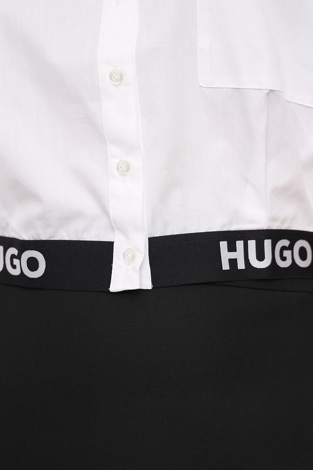 Рубашка имеет прямой крой, короткие рукава и воротник рубашечного типа. На груди расположены накладные карманы, добавляющие модели функциональности и стиля. Логотип бренда Hugo нанесен на пояс, подчеркивая принадлежность к премиальному сегменту.