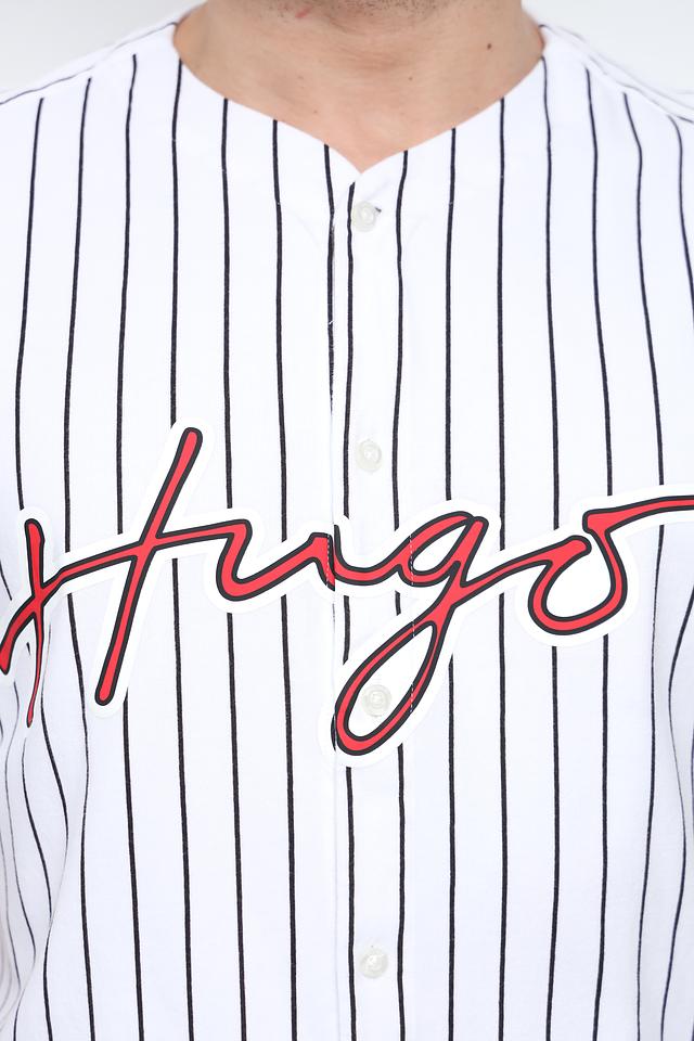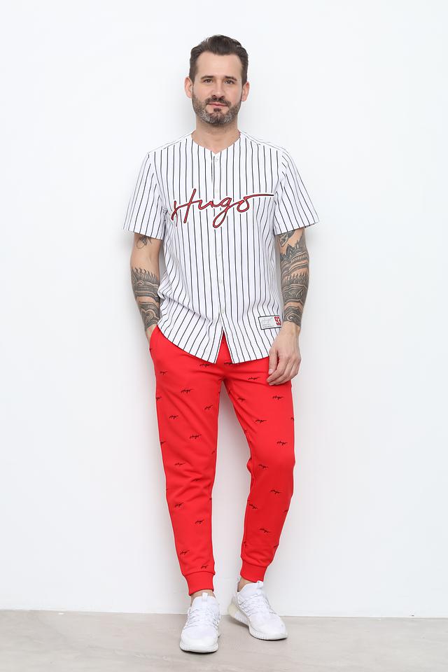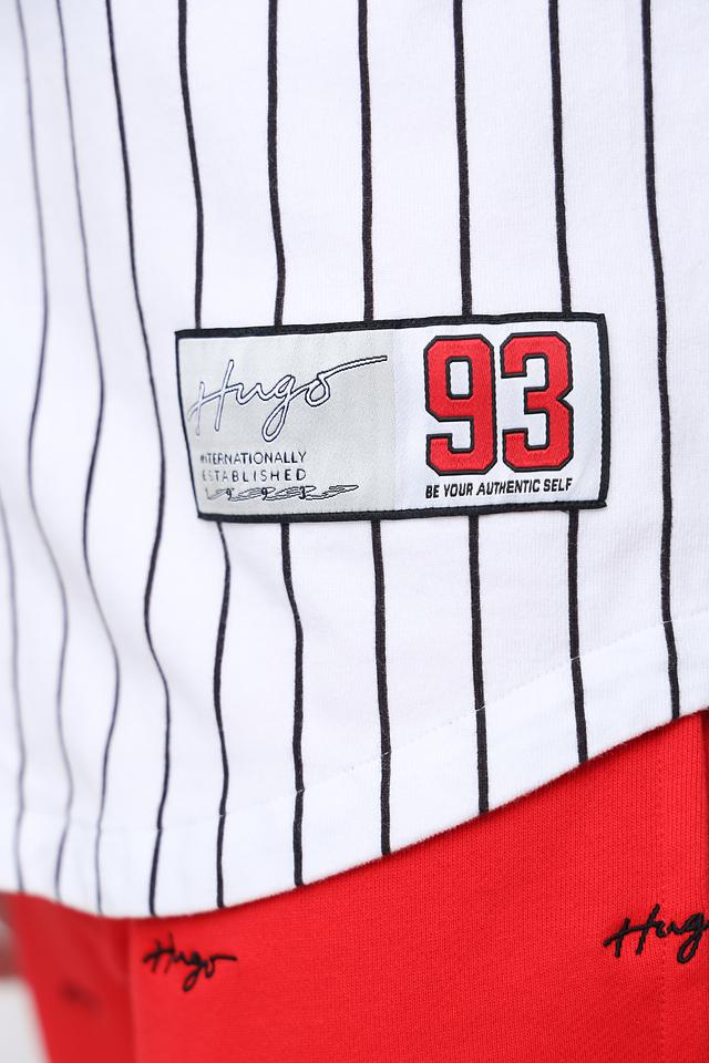 На груди и спине расположена надпись "Hugo" и номер "93", выполненные в красном цвете, что подчеркивает принадлежность к бренду. Эта рубашка станет ярким акцентом в вашем гардеробе и подойдет для различных повседневных ситуаций.