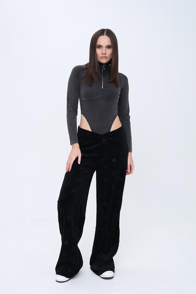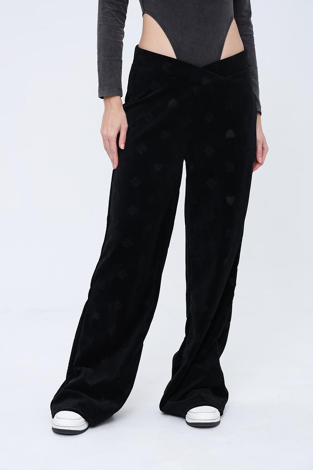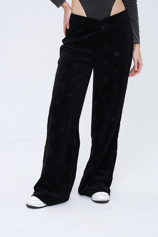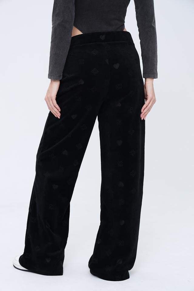 Брюки имеют классический чёрный цвет, украшенный повторяющимся принтом в виде сердечек и логотипов бренда, что придает им уникальный и запоминающийся вид. Высокая посадка подчеркивает талию, а широкий крой обеспечивает комфорт и свободу движений.