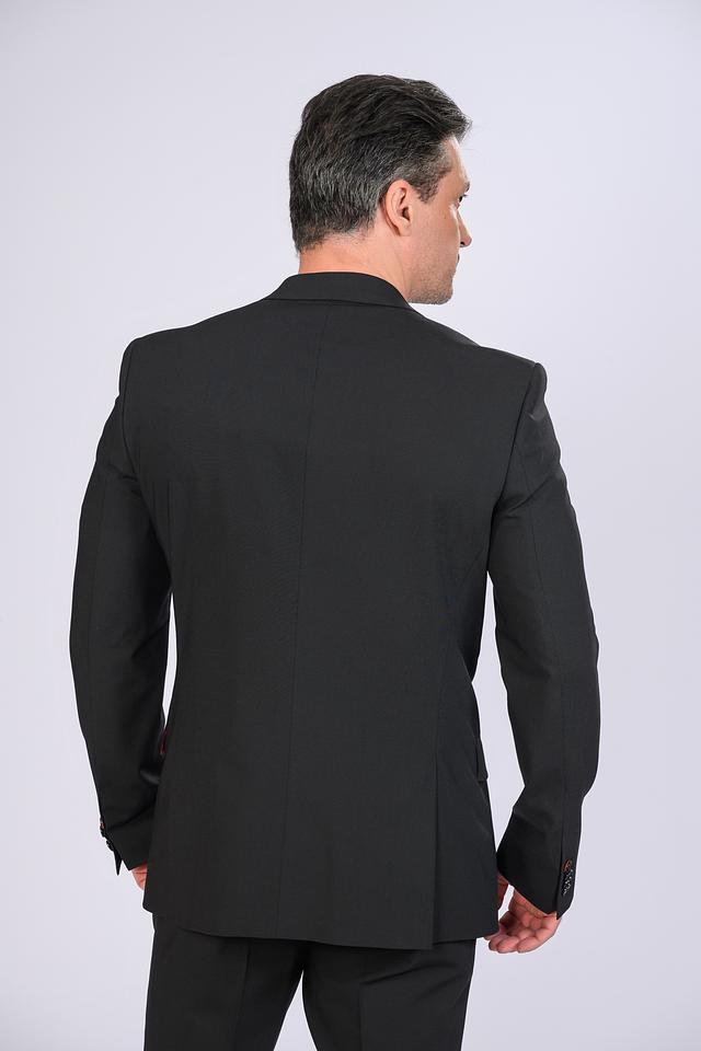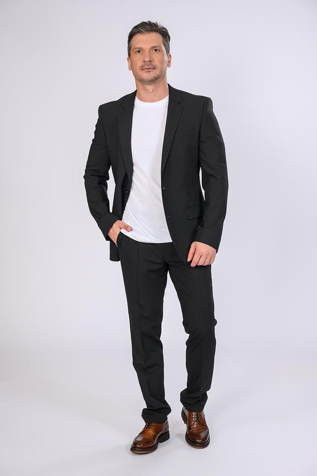 Костюм состоит из пиджака и брюк. Пиджак имеет однобортную застёжку на две пуговицы, классический отложной воротник и функциональные карманы. Брюки прямого кроя обеспечивают комфортную посадку и свободу движений.