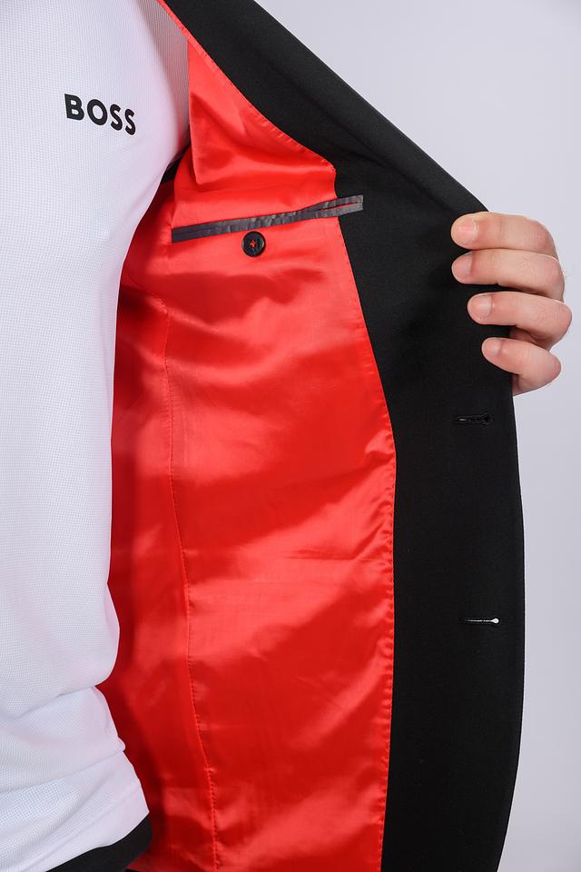 Внутренняя сторона лацкана пиджака отделана контрастной красной тканью, что добавляет костюму изысканности и индивидуальности.