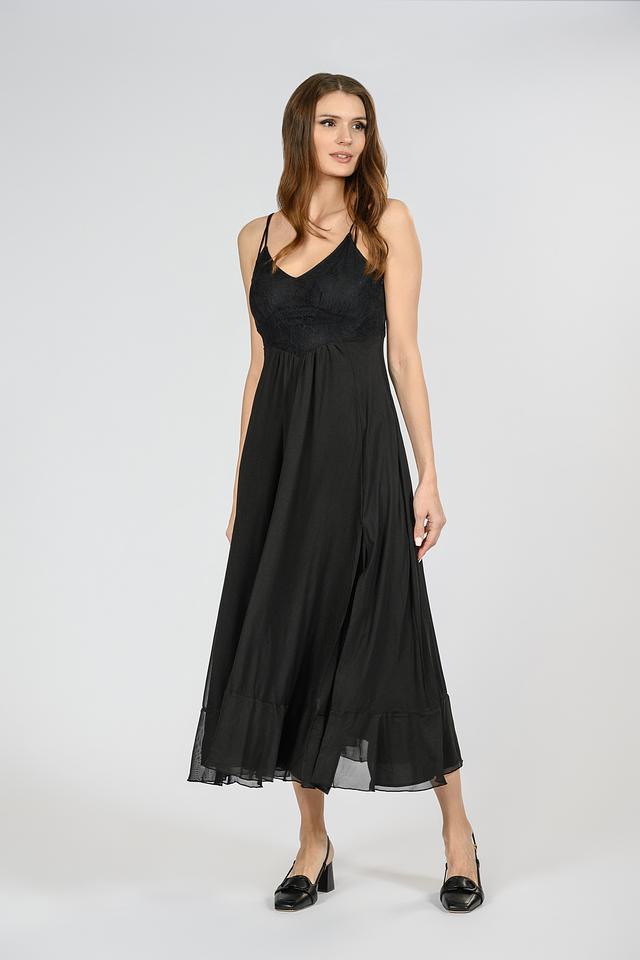 Верх платья выполнен из изящного кружева, которое придает ему особую женственность и изысканность. Юбка платья выполнена из лёгкой и струящейся ткани, что обеспечивает комфорт и свободу движений.
