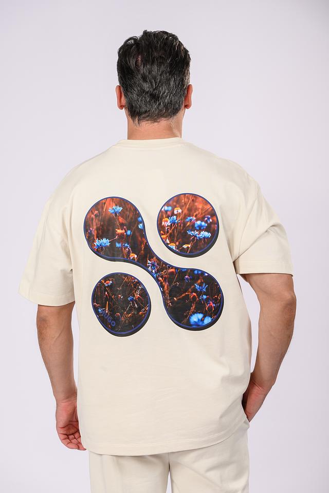 Основной цвет футболки – бежевый, который легко сочетается с различными элементами гардероба. Главной особенностью модели является яркий цветочный принт, расположенный как на передней, так и на задней части изделия. Принт выполнен в насыщенных синих и красных тонах, что добавляет футболке выразительности.